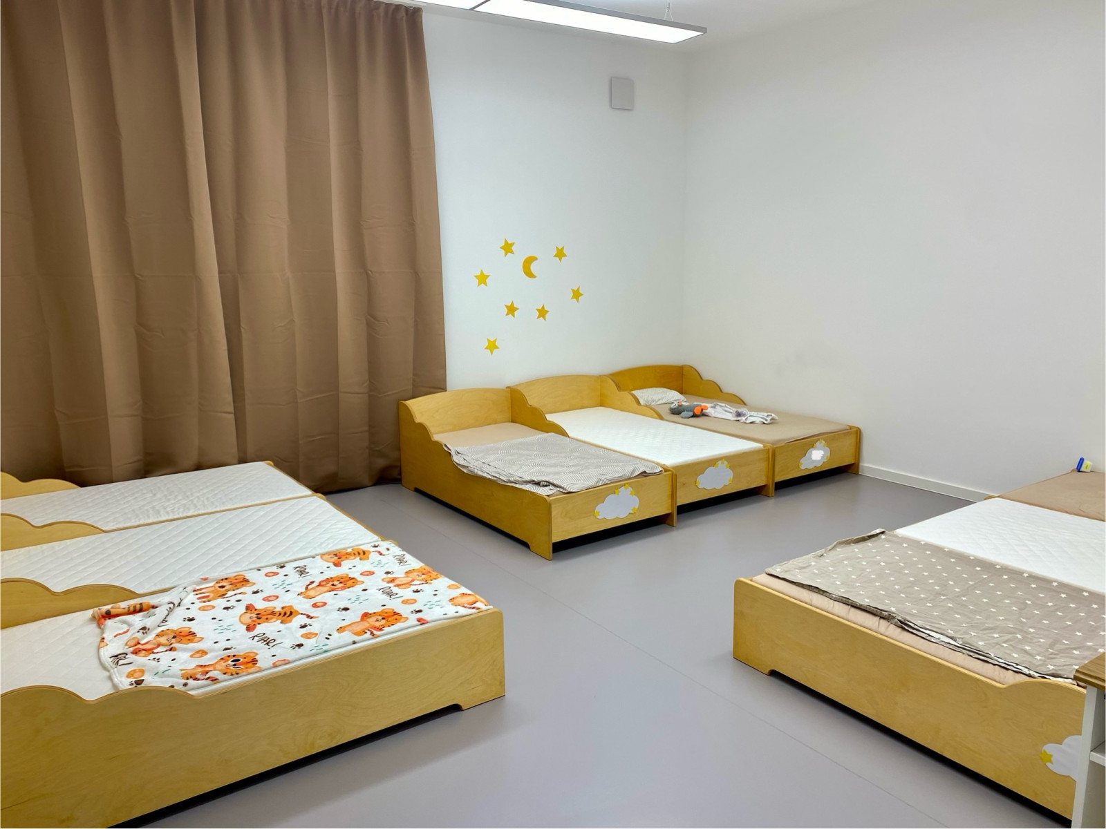 Kinder haben besondere Bedürfnisse an die Einrichtung: Deshalb hat der Waschbereich einen Wickeltisch, ein niedriges Waschbecken und eine separate Toilette. Für den Mittagsschlaf oder um sich auszuruhen gibt es einen abgegrenzten Schlafraum mit einem eigenen Bett für jedes Kind. Die Küche ist besonders wichtig: hier bereiten wir – auch oft gemeinsam mit den Kindern – das Mittagessen zu und lassen es uns zusammen am großen Tisch schmecken. In den Räumen gibt es verschiedene Bereiche wie zum Beispiel den Bewegungsbereich, die Bauecke sowie eine Puppen- und Leseecke.